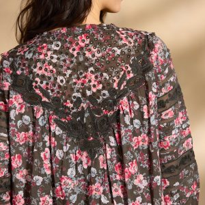Pintucking. eyelet embroidery and lace details add a feminine touch to our easy knee length dress in a flowing A-line and special floral print. Functional front center placket with shell buttons and two shell button closure at the sleeve cuffs. Side seam pockets. Separate slip included. Cotton. Machine wash. Imported. Exclusive. Sizes XS (0?C2). S (4?C6). M (8?C10). L (12?C14). XL (16?C18). XXL (20?C22). Approx. 36l.