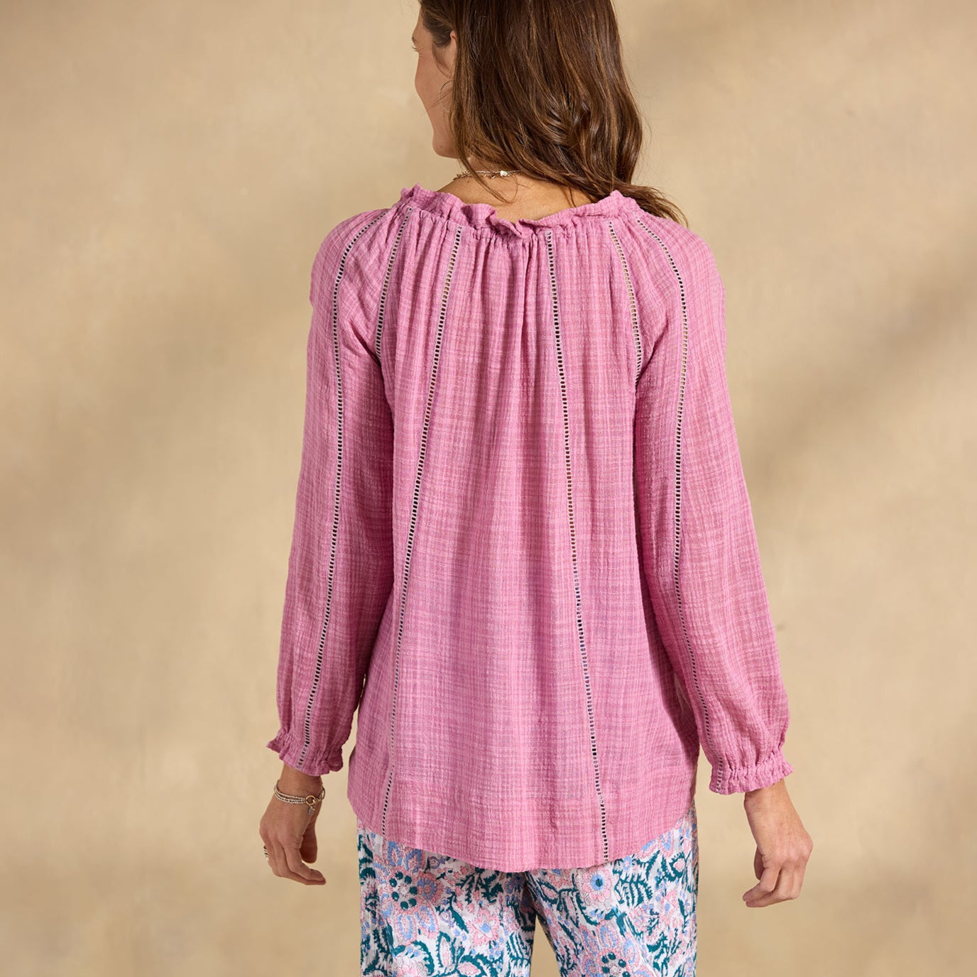 Embrace your artistic spirit in our sheer. easy-fit top with ladder lace. ruffle neckline and tassel ties. Cotton/viscose. Hand wash. Imported. Exclusive. Sizes XXS (00). XS (0?C2). S (4?C6). M (8?C10). L (12?C14). XL (16?C18). Approx. 24.5l