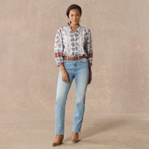 Our easy. mixed print shirt with a beautiful border print is complete with feminine pintucks and lace trim insets at the center front. Three-quarter sleeves. Shirttail hem. notch neckline. Cotton. Machine wash. Imported. Exclusive. Sizes XS (0–2). S (4–6). M (8–10). L (12–14). XL (16–18). XXL (20–22). Approx. 25.5l.