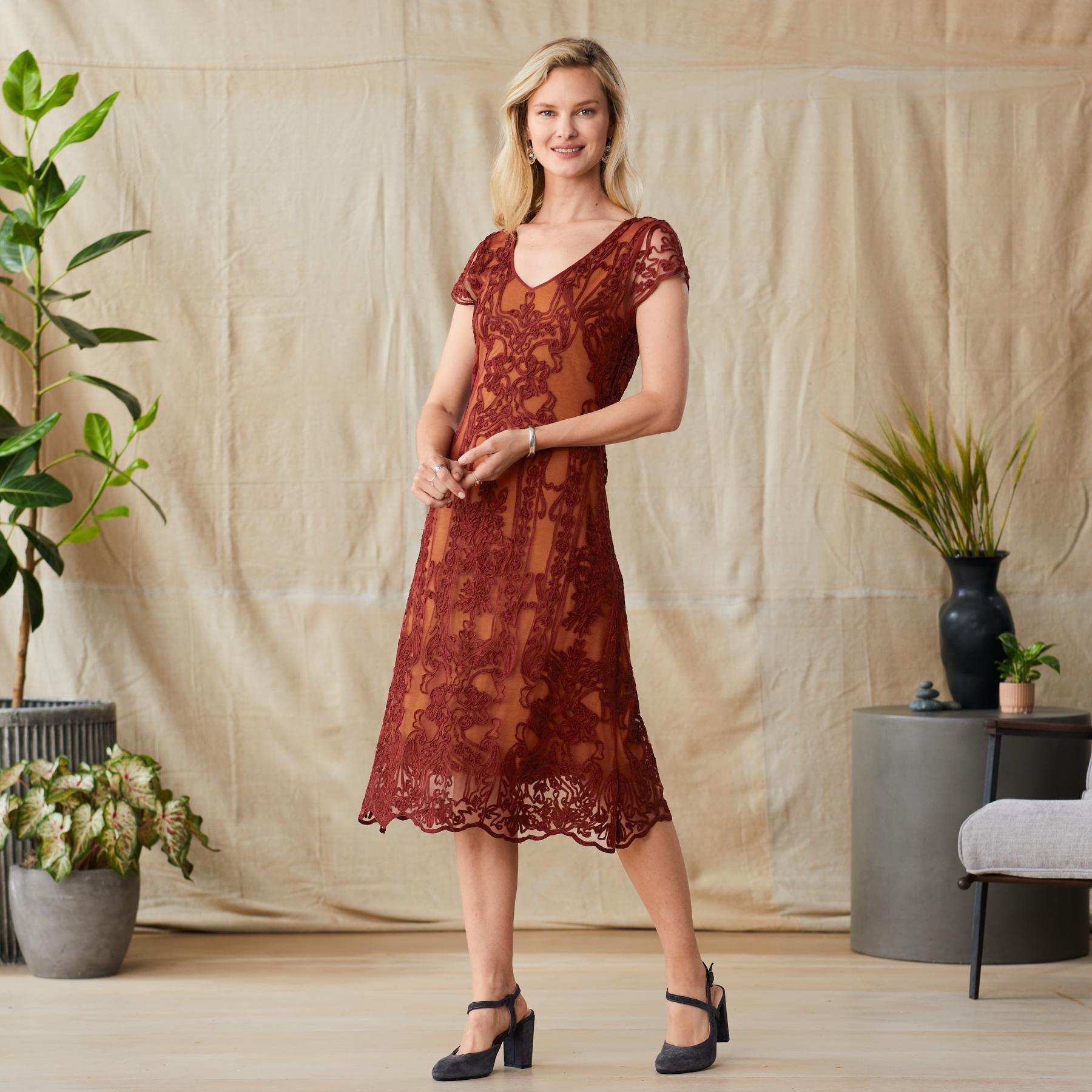 Easy. fit and flare. embroidered soutache mesh dress. with cap sleeves. scalloped hem and sleeves and a flattering. soft V-neckline. Pull-on styling. Lined. Nylon. Dry clean. Imported. Exclusive. Sizes XXS (00). XS (0-2). S (4-6). M (8-10). L (12-14). XL (16-18). Approx. 41l.