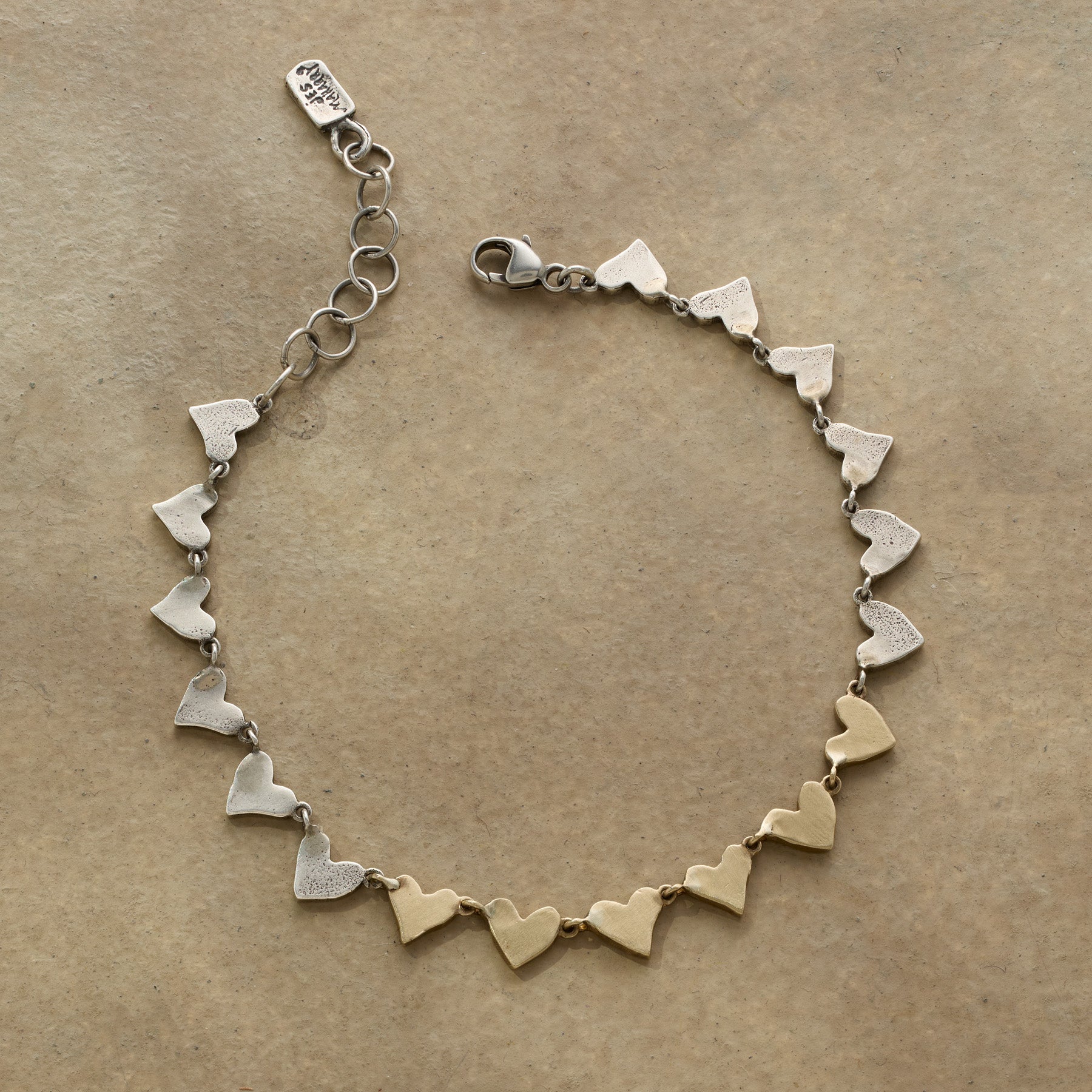 Jes MaHarry makes all her jewelry creations with heart??especially this one. Handmade of sterling silver and 14kt gold hearts. her bracelet secures with a sterling silver lobster clasp. USA. 6 1/2?C7 1/2l.