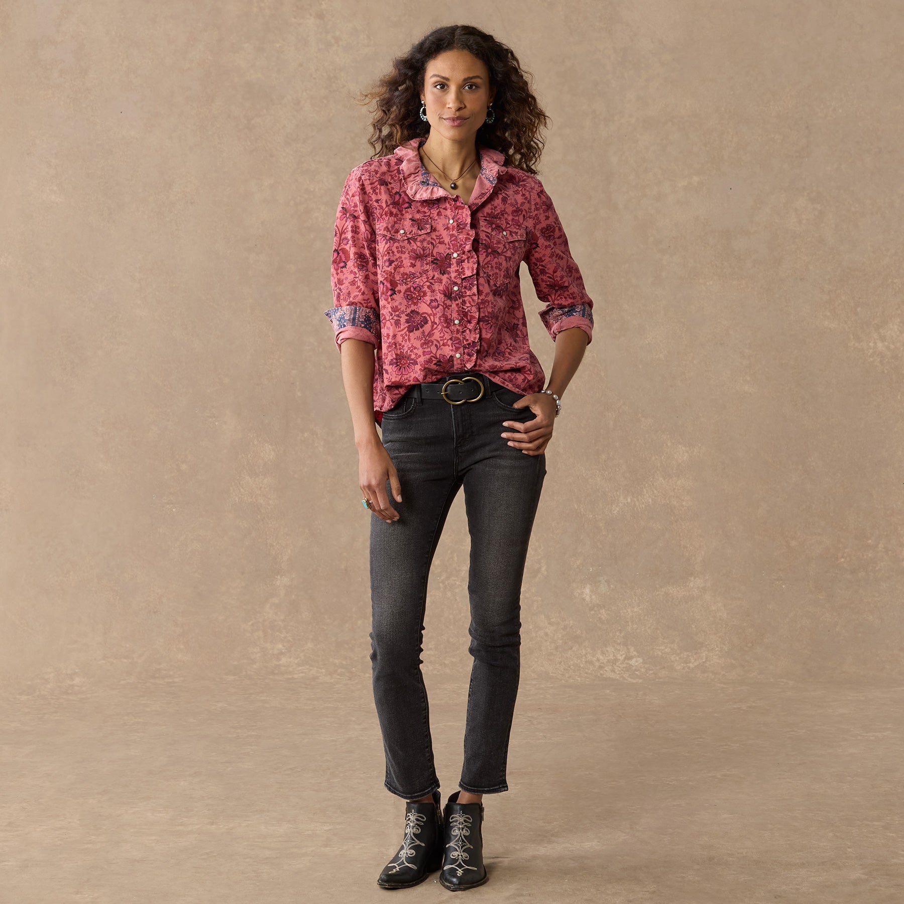 Floral printed and over-dyed. this Western inspired. soft corduroy shirt is beautiful with ruffles at the neckline for a feminine twist. Two patch pockets. snap closure and bandana print detail inside. Cotton. Machine wash. Imported. Exclusive. Sizes XS (0–2). S (4–6). M (8–10). L (12–14). XL (16–18). XXL (20–22). Approx. 26l.