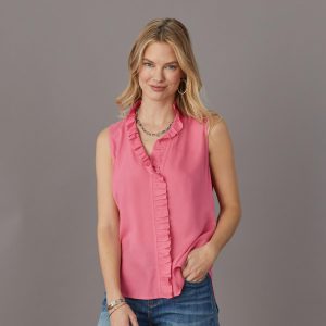 A Sundance favorite. now in a sleeveless silhouette. with the same pleasing ruffle detail and hidden button placket that we’ve all come to love. Rayon. Machine wash. Imported. Sizes XS (4). S (6). M (8–10). L (12). XL (14). XXL (16). Approx. 25.5l.