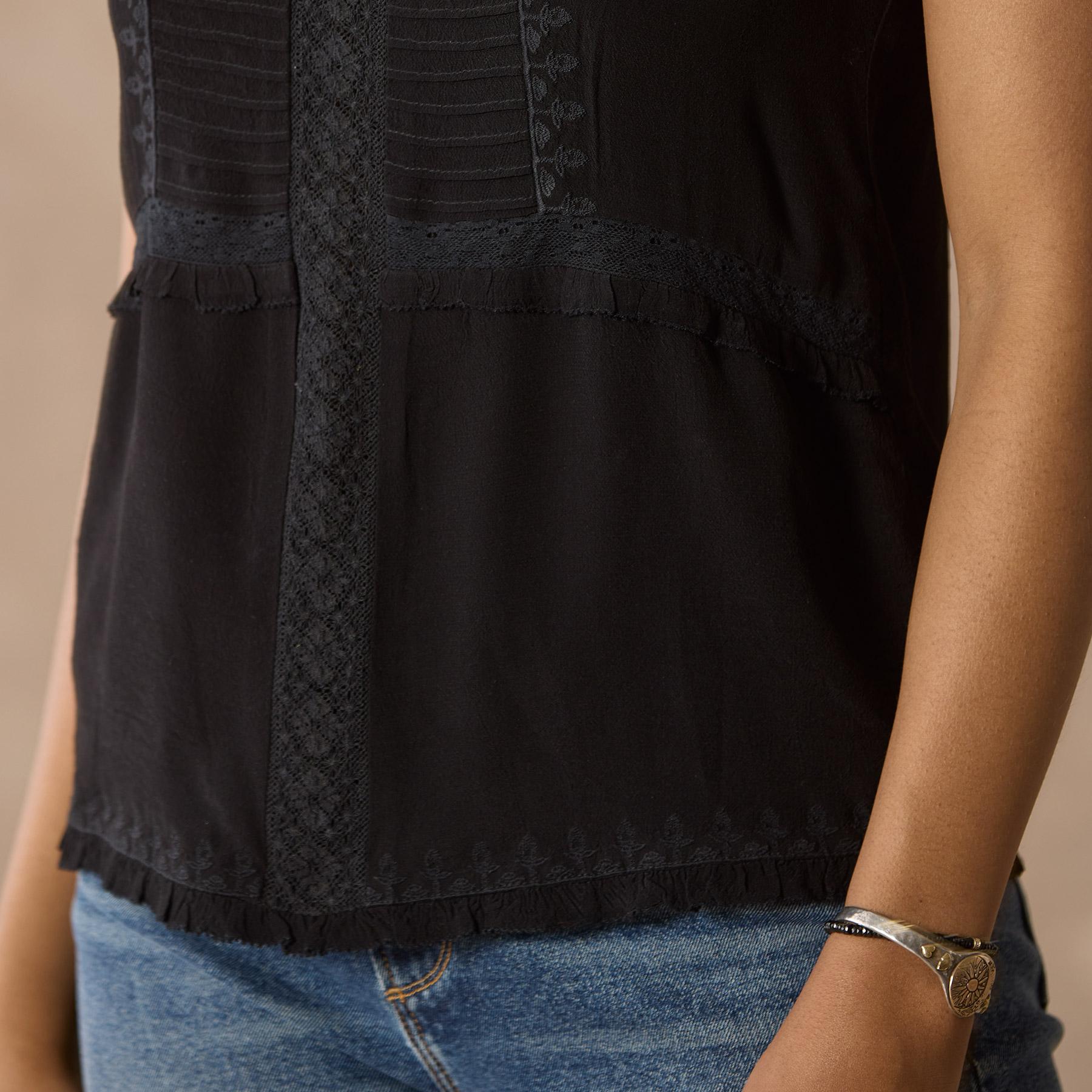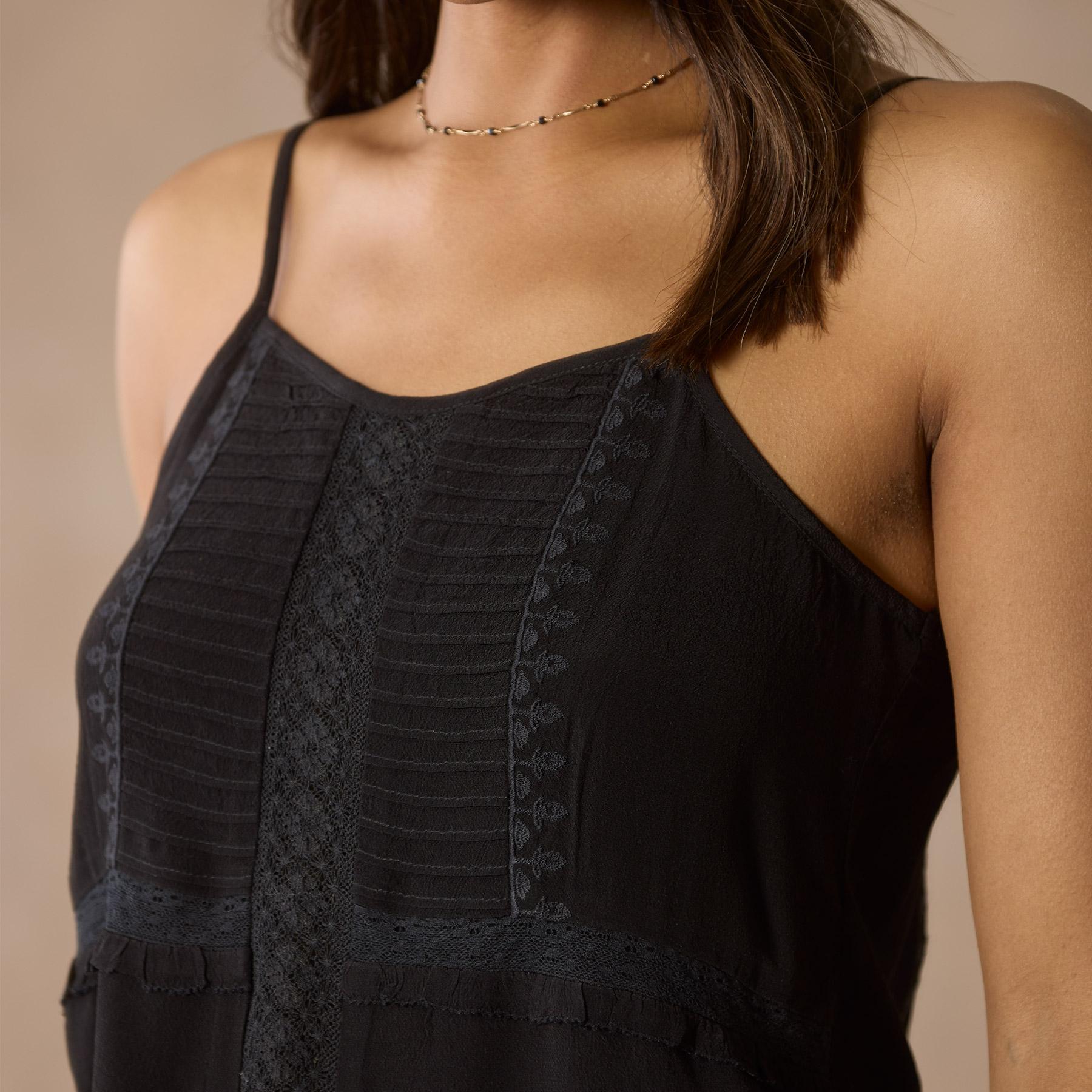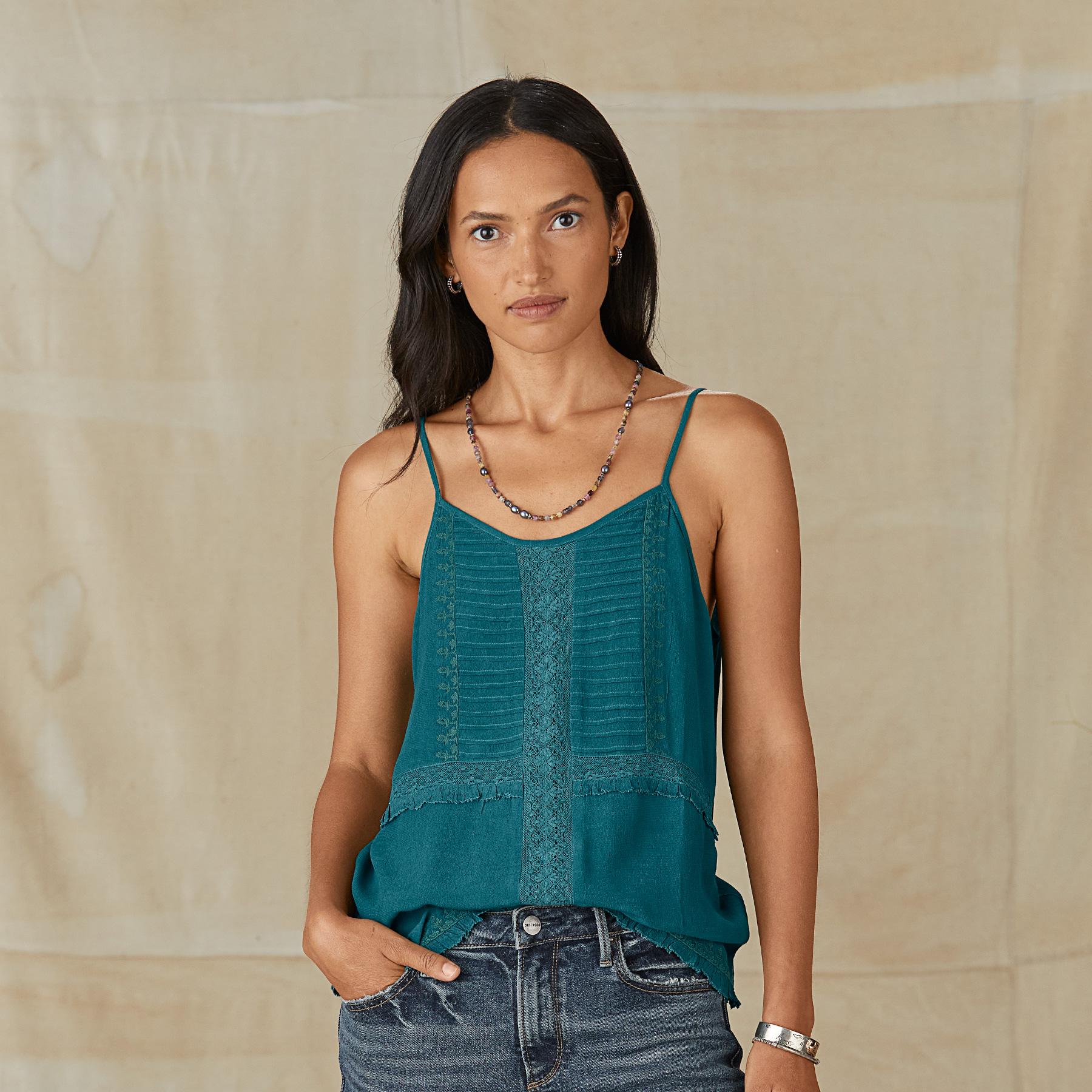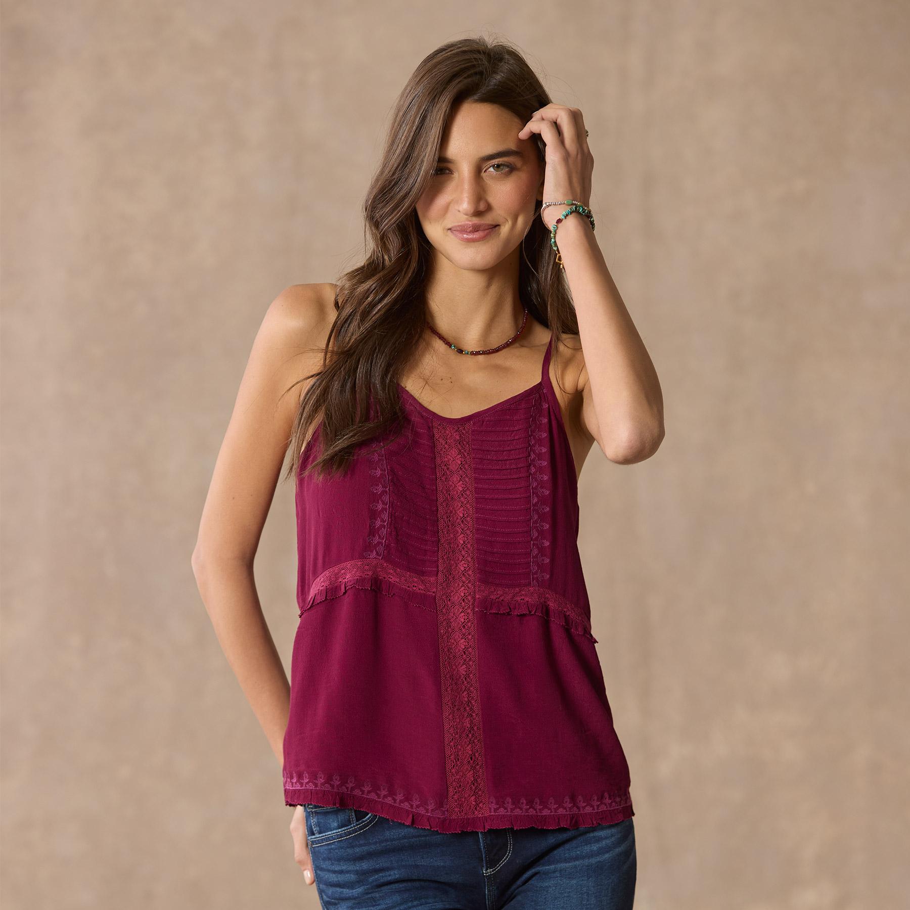 Drawing inspiration from vintage beauty. our lovely camisole is graced with lace insets. pintuck details. tonal embroidery and ruffles. Viscose. Machine wash. Imported. Exclusive. Sizes XS (0-2). S (4-6). M (8-10). L (12-14). XL (16-18). XXL (20-22). Approx. 24.5l.